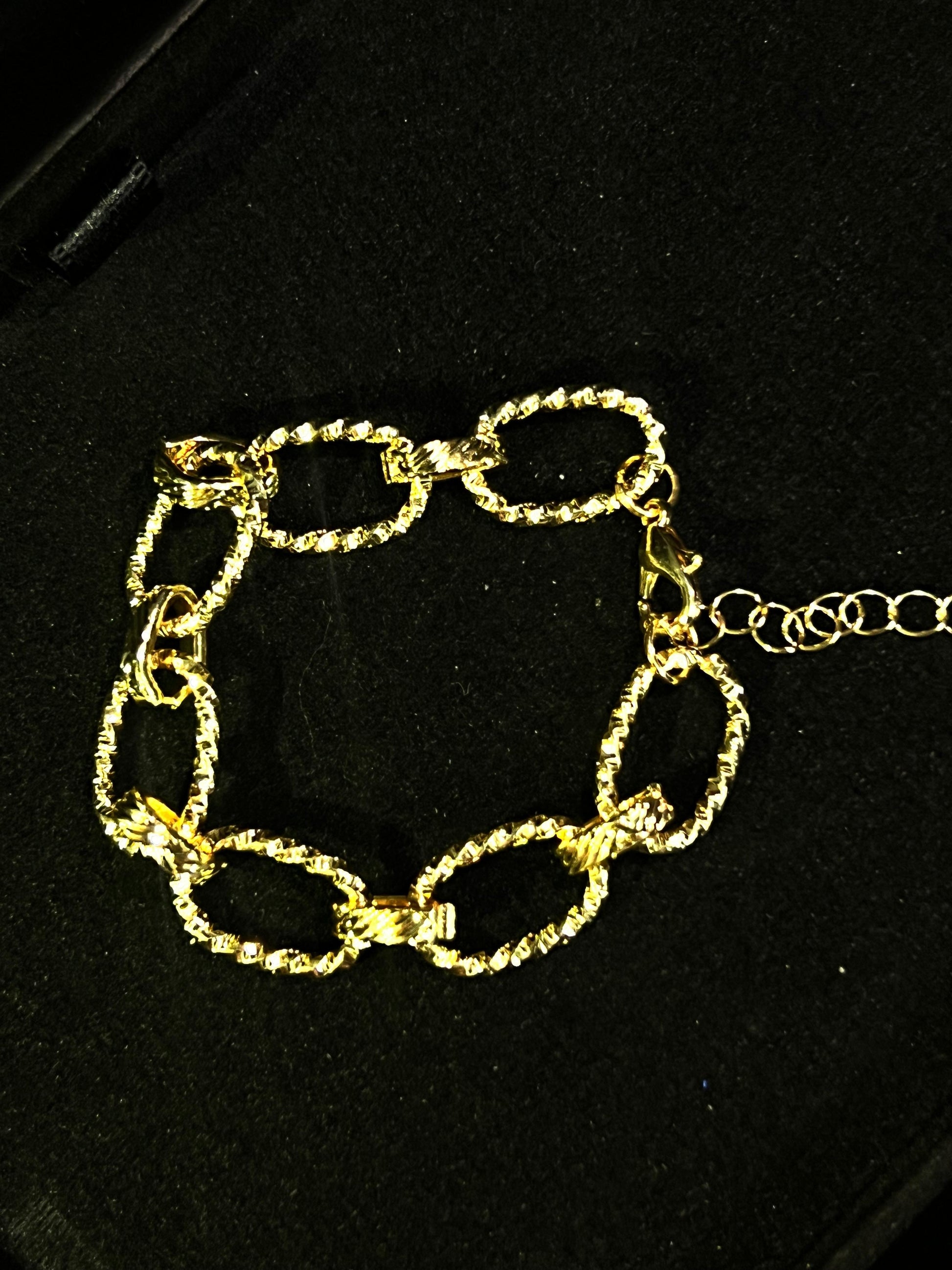 This is a gold-toned bracelet with large textured oval links and an adjustable chain.The design combines bold statement style with a touch of elegance, making it suitable for both casual and formal wear.