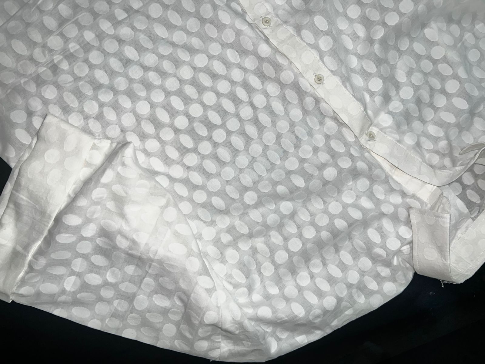 White sheer shirt with oval polka dots, button front, stand collar, and sleeves with cuffs. Light and airy fabric for a casual look.